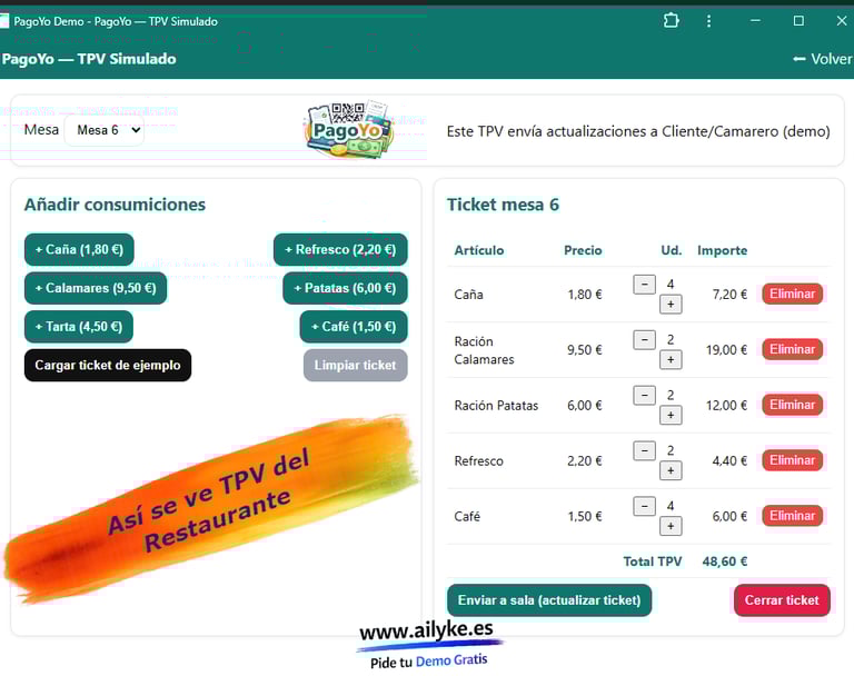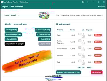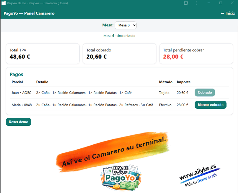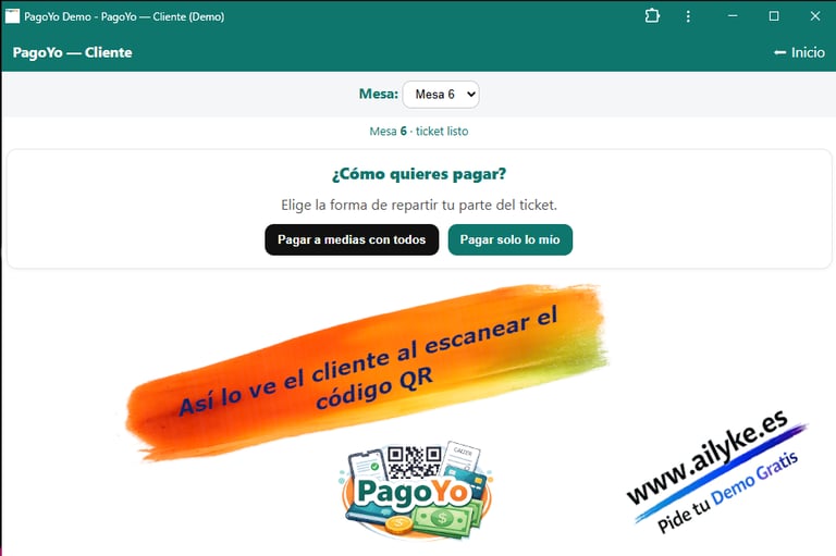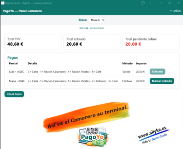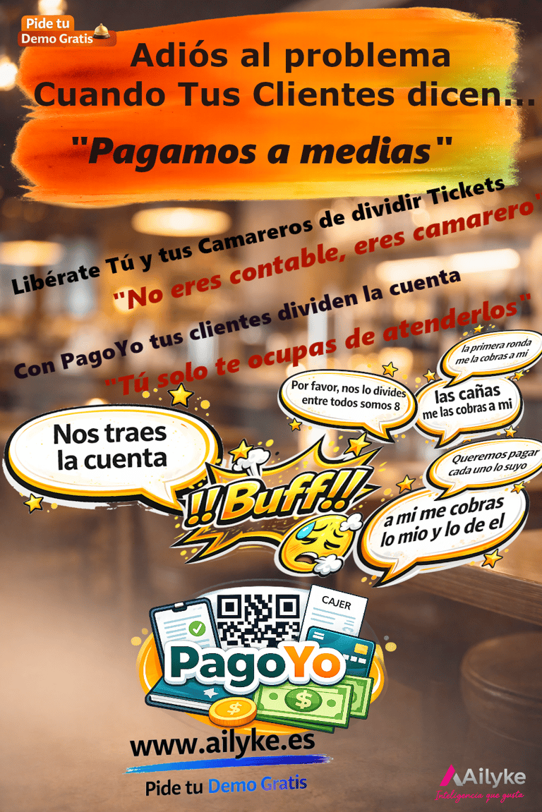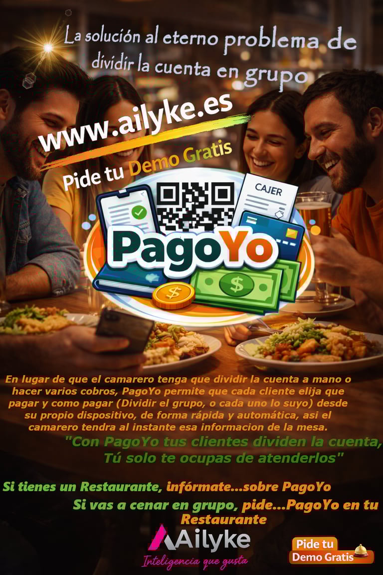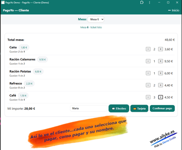 En lugar de que el camarero tenga que dividir la cuenta a mano o hacer varios cobros, PagoYo permite que cada cliente elija que pagar y como pagar (Dividir el grupo o cada uno lo suyo) desde su propio dispositivo, de forma rápida y automática, asi el camarero tendra al instante esa informacion de la mesa.